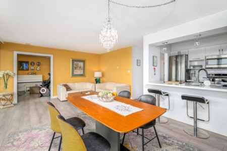PENTHOUSE suite with fabulous 270 degree views from downtown Vancouver, N Shore Mountains and Mount Baker. Freshly painted, very spacious bright top floor corner. Features entertainment siz…