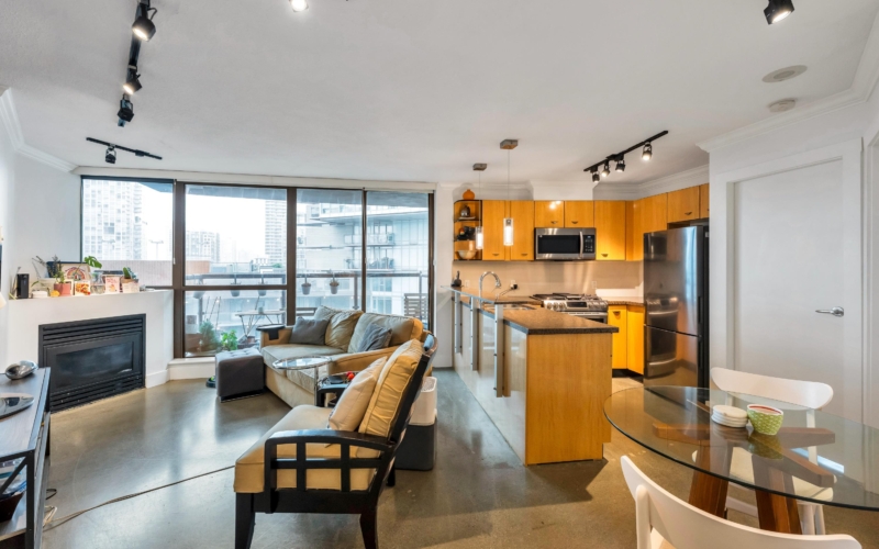 Welcome to 501, perfectly situated on the edge of Yaletown! This beautiful and well-appointed one-bedroom plus den suite offers a functional layout, featuring a west-facing patio with peek-a-boo views of False Creek and the city skyline. Tasteful updates includes polishes concrete flooring, a stainless steel gas stove with cooktop, stylish barn doors for the laundry and closet, designer blinds, and a quartz countertop in the bathroom. Residents enjoy exceptional building amenities, including an outdoor pool, hot tub, fully equipped gym, guest suite, concierge service, and an oversized party room. Located just steps from the seawall, parks, restaurants, shopping, coffee shops, and everyday conveniences - everything you need is only minutes away.