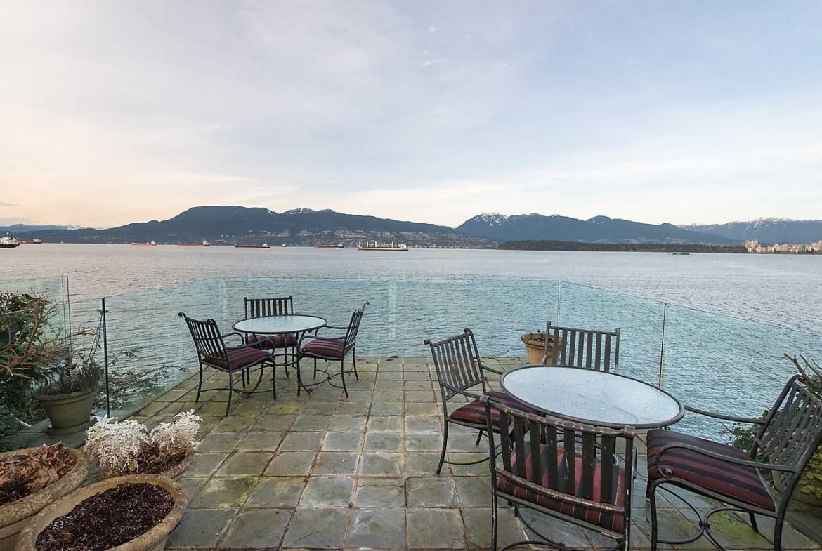Stunning Waterfront! Situated on a prime part of the water, this home has arguably the best view of any other property on the water. This expansive view takes advantage of the adjoining park & floor to ceiling windows. Heated marble floor thru-out, open main floor with deluxe kitchen, bar, entertainment size rooms, extensive use of glass, top of the line fixtures. Private bedroom and bath on main as well. Upstairs boasts two master suites both with luxurious ensuites and 3 decks! Garage features parking for 4 cars. Gorgeous waterfront private patio. This house is the perfect size, perfect for entertaining large or small parties. Exquisite. Private roadside security fencing add to the privacy of this gem!