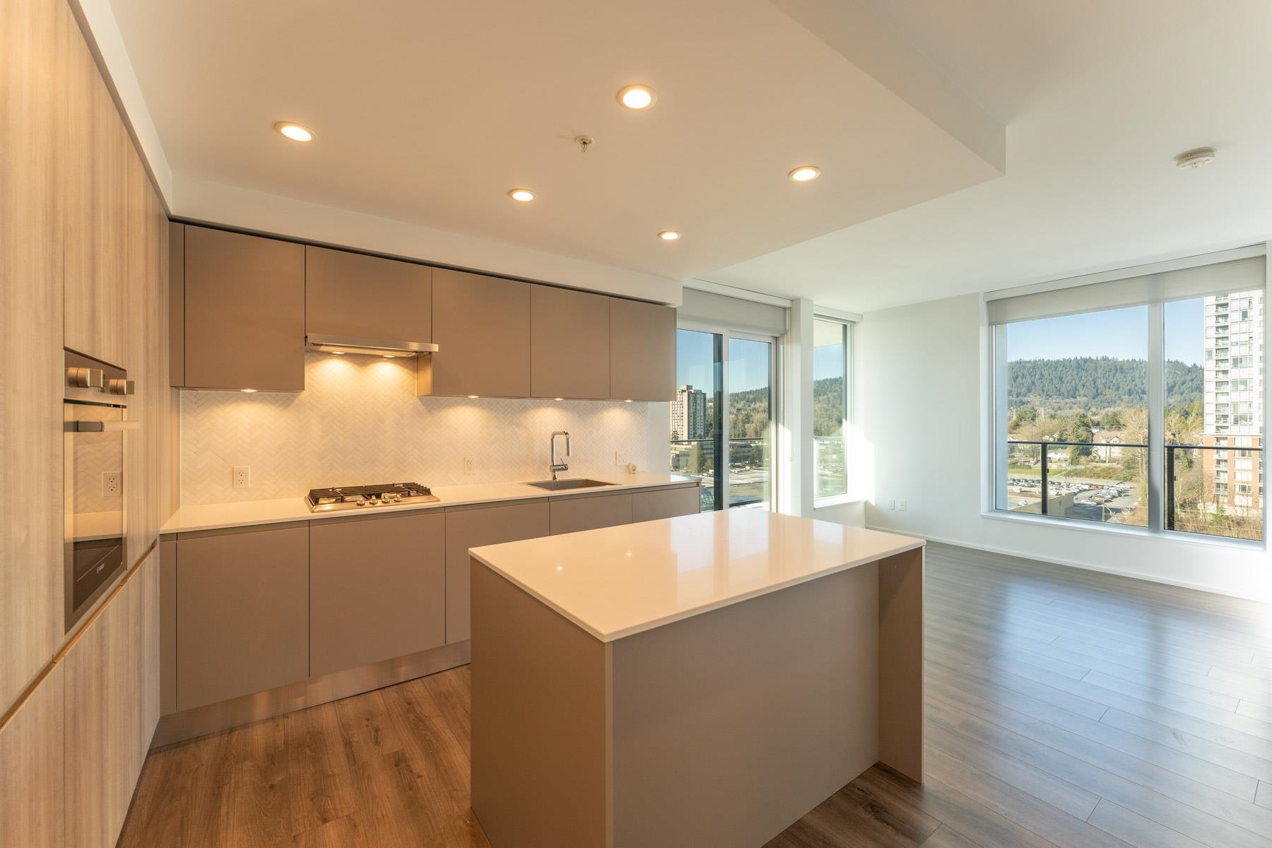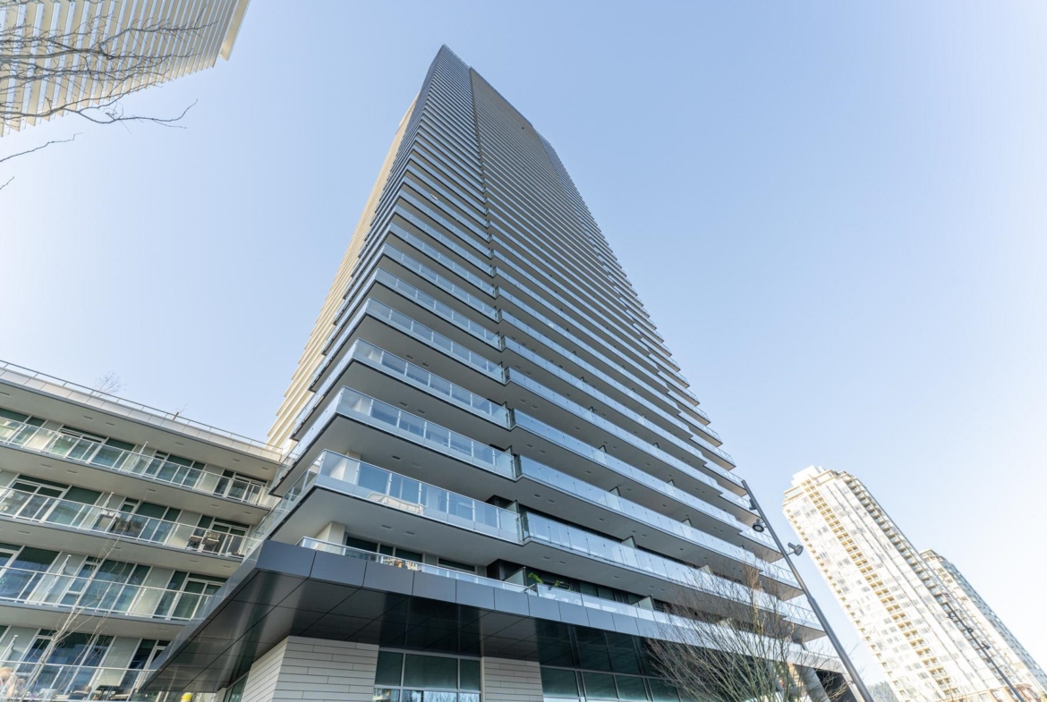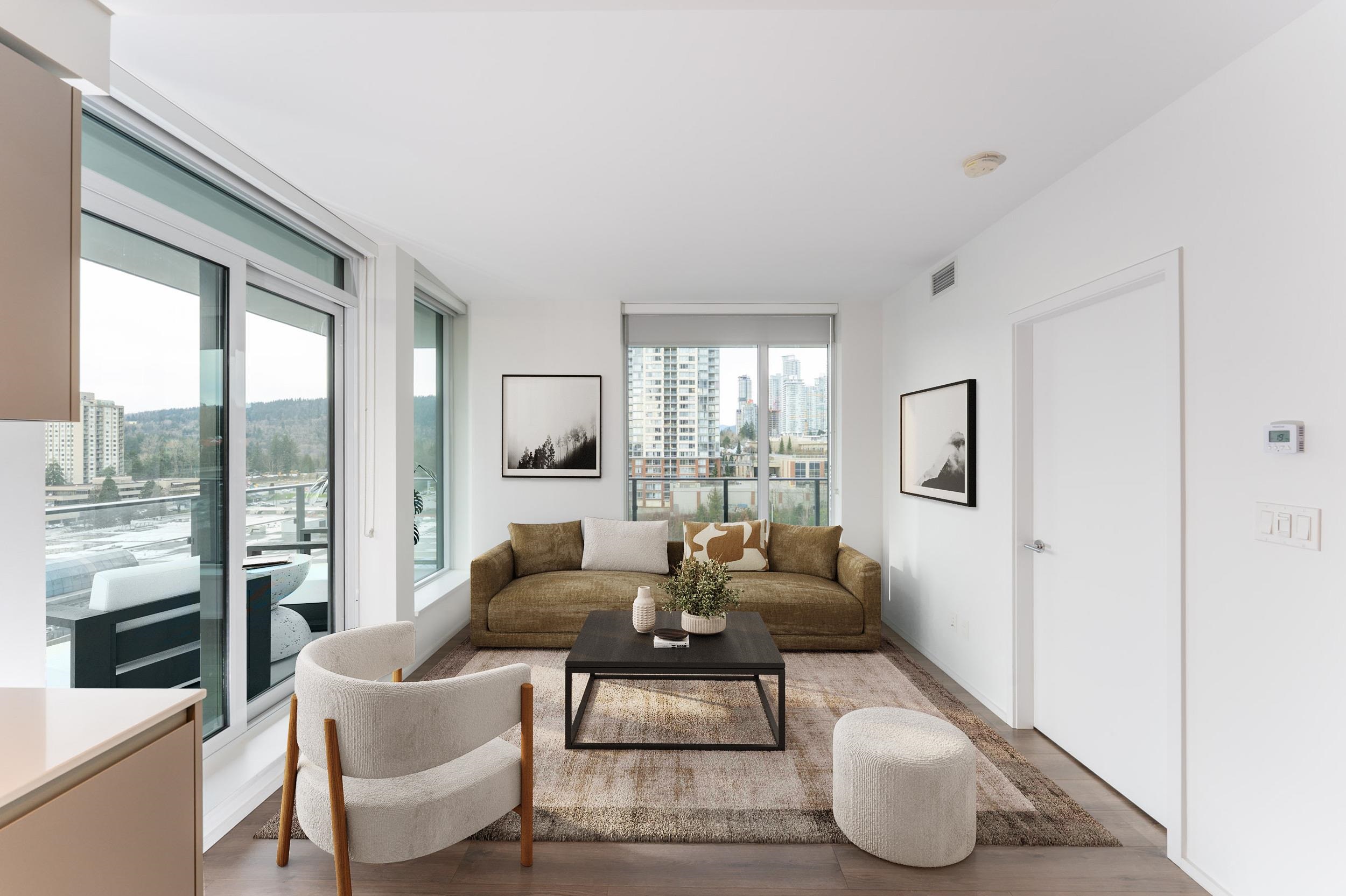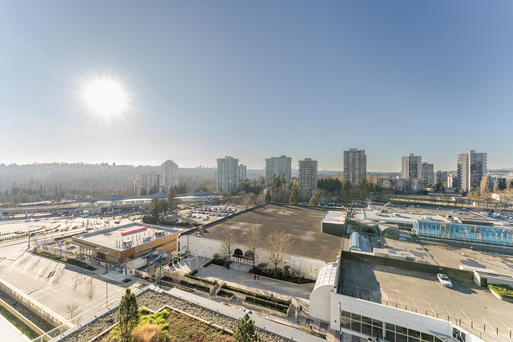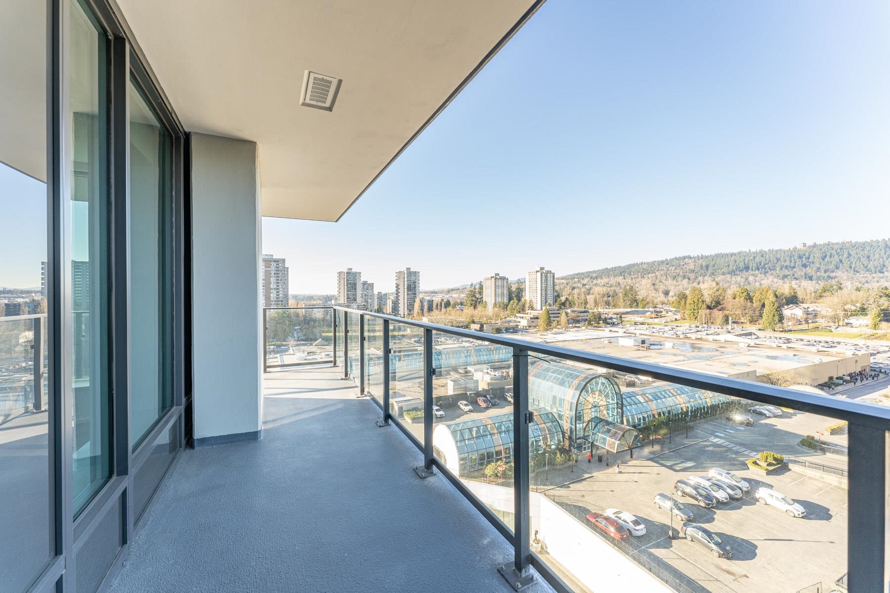 LARGE den with this gorgeous 2bed 2bath corner unit! Bright & soothing Northwest exposure on quiet side of the building w/ views of Burnaby Mountain. Two ensuite baths w/ upgraded shower stall in the 2nd ensuite. Kitchen has gas cooktop, built-in wall oven, fridge and dishwasher. Lots of cabinet space for all your cooking needs. Master has walk-in closet & an additl. access to the HUGE wraparound balcony to use as your own private outdoor retreat. Perfect floor for those with height anxiety. Direct access to a community garden and BBQ area w/ gazebo. This level & below also have exclusive use of 7 elevators instead of 5. Restaurants, shops, banks and grocery on site. Lougheed mall next door. Clubhouse amenities. Urban convenience and livability at its finest!