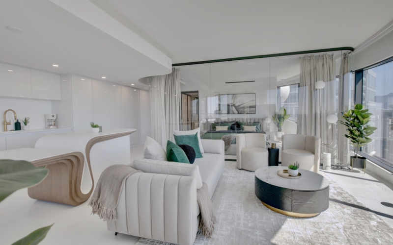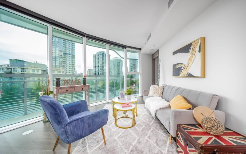 Beautifully designed 900 sq?ft residence situated high in Vancouver’s celebrated Butterfly tower. Showcasing a sleek, contemporary aesthetic with curated furnishings, stylish décor, and a p…