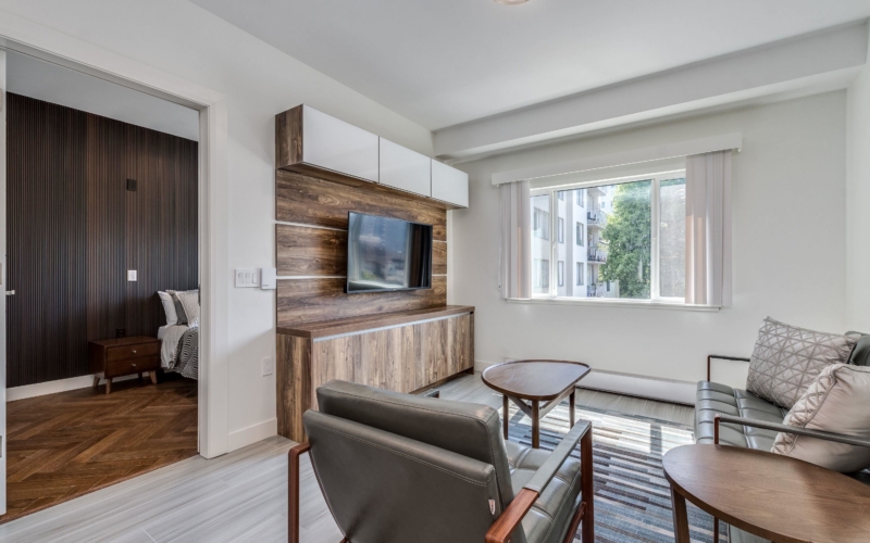 Welcome to The George". Gorgeous 1 bed and den unit at west end area. South facing unit with enough sunlight. Open concept floor plan, new flooring(2025). Well-maintained building with an e…